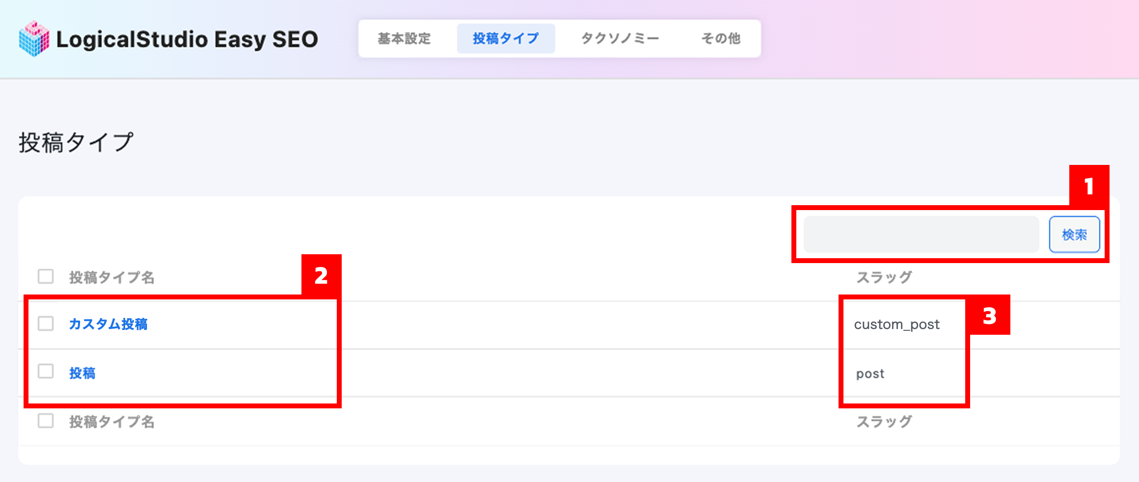 | 3 | スラッグ | 登録されている投稿タイプやカテゴリのスラッグが自動で表示されます |