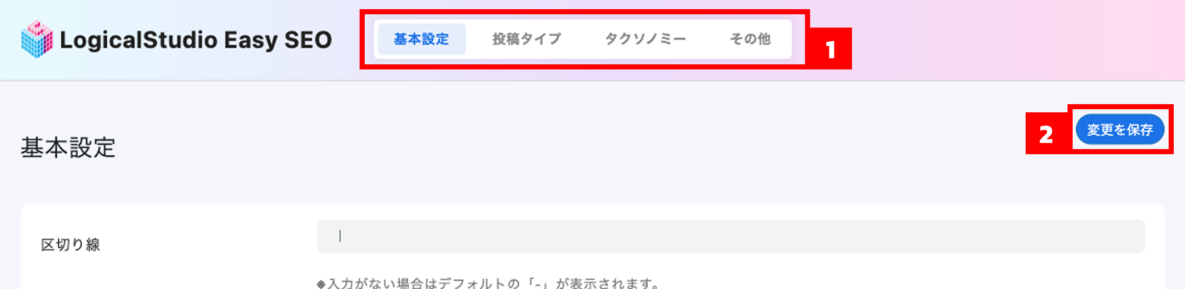 | 1 | 区切り線 | <title> で使用する区切り線が設定できます(デフォルト:「-」) |