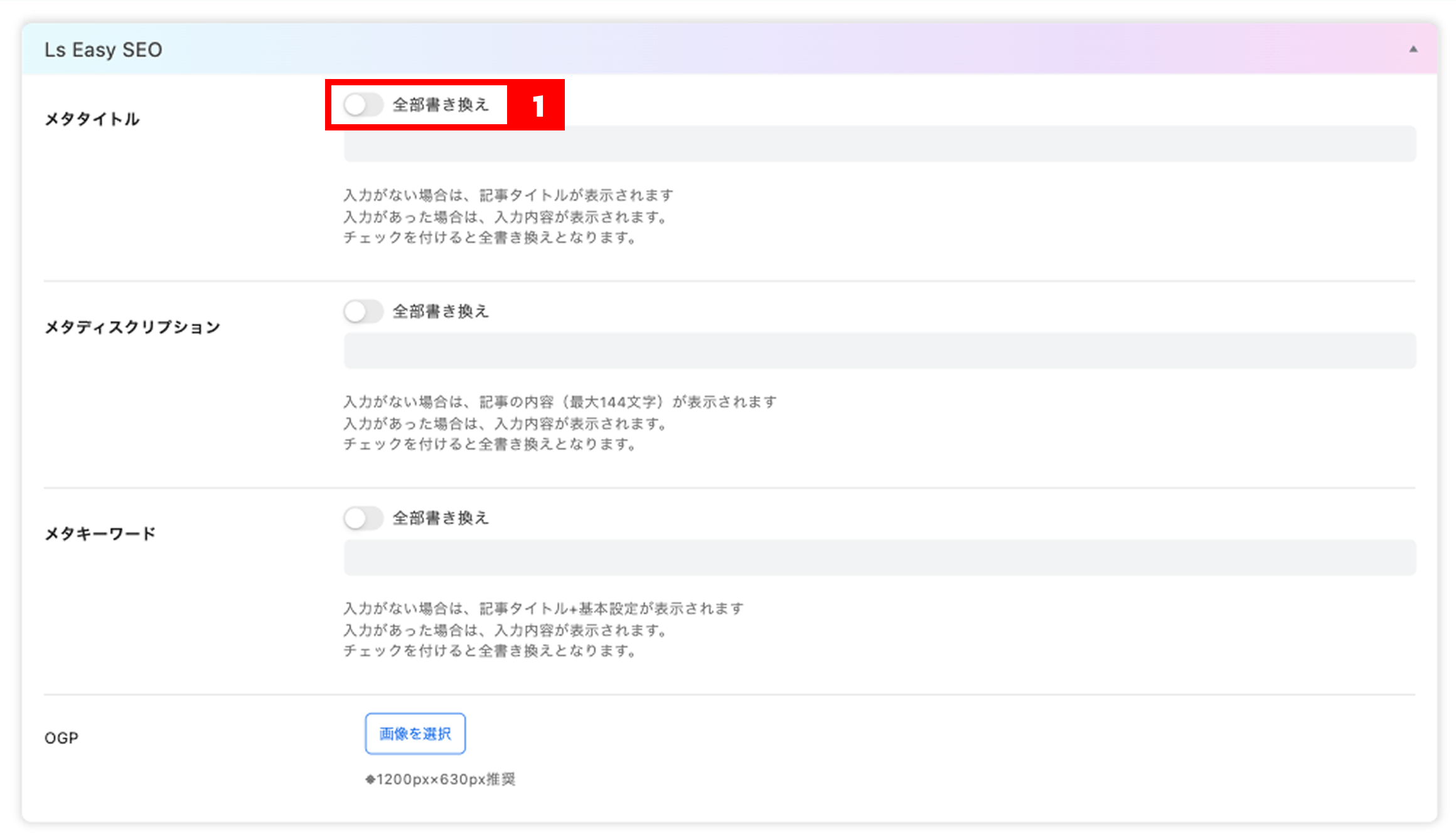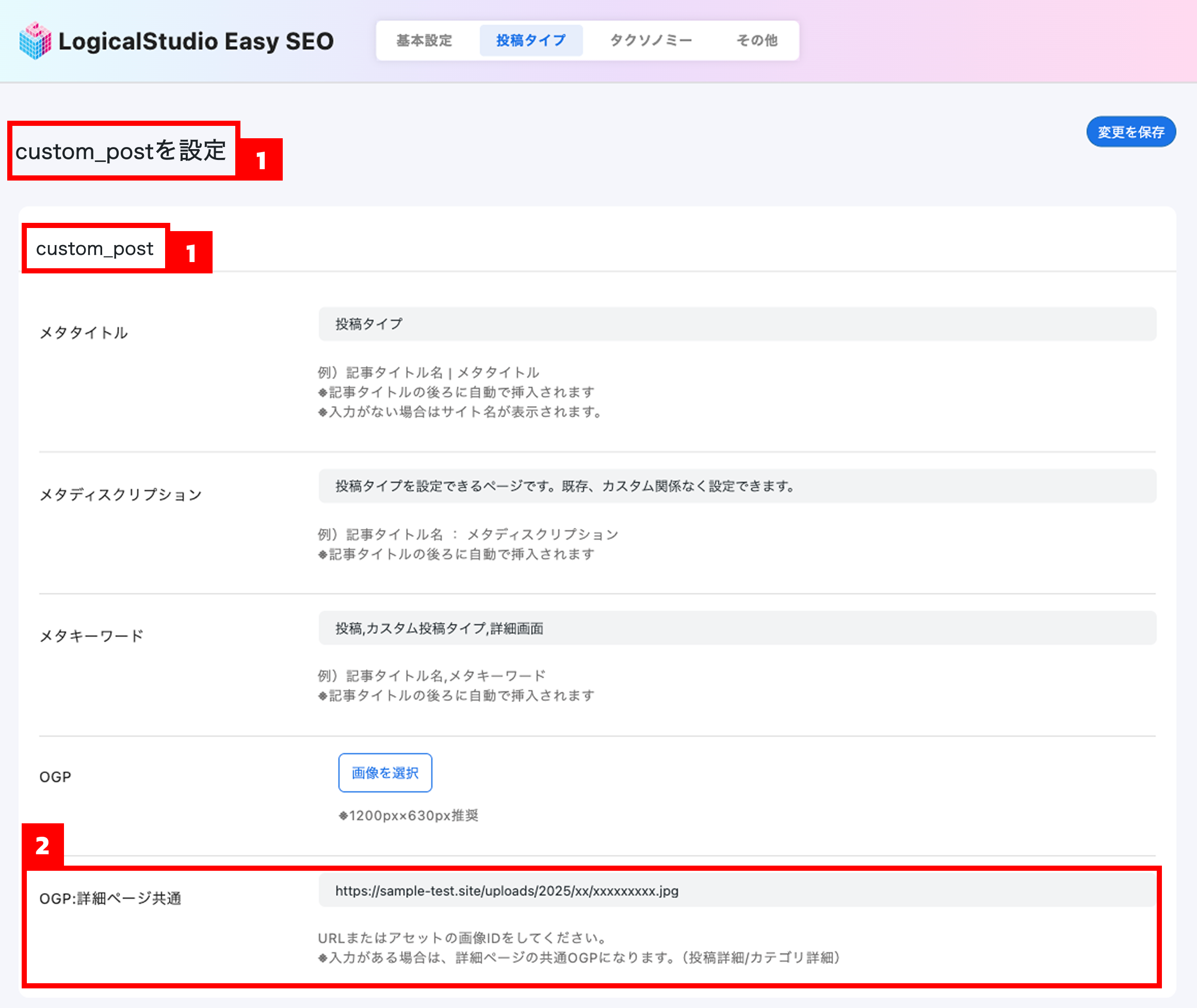 | 2 | OGP:詳細ページ共通 | 選択した投稿タイプのOGPを共通で設定できます。 ※各詳細ページごとのOGP設定については、後ほど説明します |